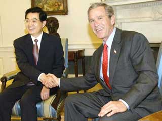 Updated: 2009-01-07 16:41 Visiting Chinese Vice President Hu Jintao meets US President George W. Bush and vice President Dick Cheney in Washington on May 1, 2002.