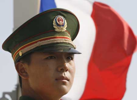 flag near Tiananmen Square in Beijing October 25, 2006. French President Jacques