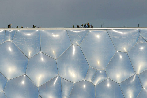 Workers work atop of the National Aquatic Center, nicknamed the "Water Cube", in Beijing November 4, 2006. The installation of inflatable films of the center has been completed. [newsphoto]