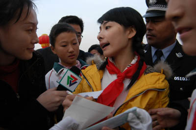Olympic balance-ream gold medalist Liu Xuan is interviewed at the opening ceremony of the Xing Huina Hope Elementary School at Shizixing Village in Weifang, East China's Shandong Province, Thursday, November 9, 2004. The school is funded by the China Sportspersons' Education Fund, which was founded by former Chinese world and Olympic champions. [newsphoto] ![]()