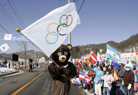 A resident of Pyongchang, dressed in a bear costume, waves a Olympic flag
