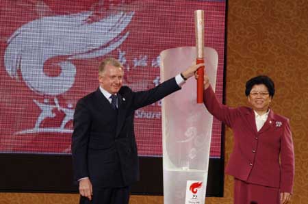 Councilor Chen Zhili hold the Beijing Olympic torch during its unveiling in
