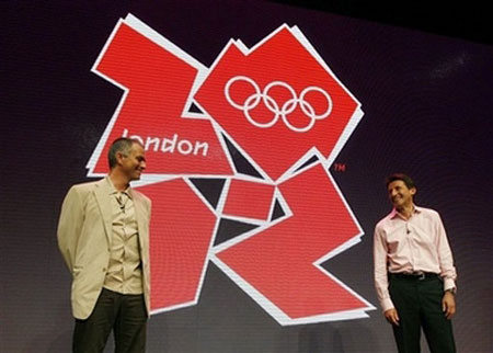 Jose Mourinho, left, and London 2012 Chairman Sebastian Coe stand with the London 2012 Olympic logo, London, Monday June 4, 2007. London Olympic organizers unveiled Monday a neon-colored, jigsaw-style logo for the 2012 Games. The four jagged pieces combine to form the numbers 2012 with the logo in a variety of pink, blue, green and orange colors. [AP]