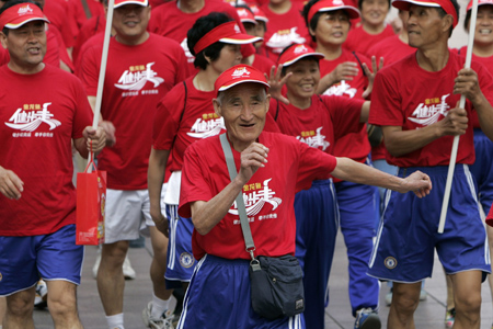 People walk to promote the 2008 Beijing Olympics at Nanjing Road in Shanghai June 10, 2007. About a thousand local residents took part in the 1 km (0.6 miles) event.[Reuters]