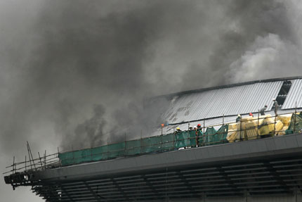 Firemen extinguish a fire at the Peking University gymnasium, which is under construction to host the table tennis tournament at the 2008 Beijing Olympics, in Beijing July 2, 2007. The fire broke out on Monday, but damage appeared limited and there were no casualties, officials and witnesses said. [Reuters]