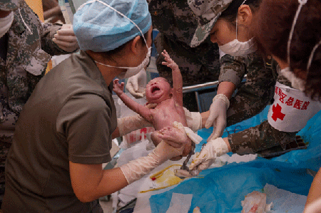 The birth of Chen Qirui in a makeshift medical tent cheers people in quake-hit Taiping township, Sichuan province, on Tuesday. Chen Cheng / Xinhua