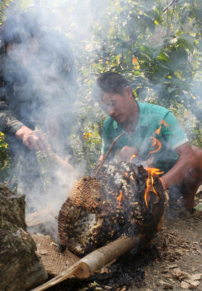 Workers burn a hornet's nest in a forest in Ankang, Shaanxi province, on Oct 6. Run Banhui / for China Daily |
