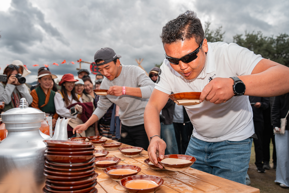 Local residents drink highland barley wine at a "Lingka" festival in Chonggyai county of Lhokha, Southwest China's Xizang autonomous region, on Sept 13, 2025. [Photo/Xinhua]