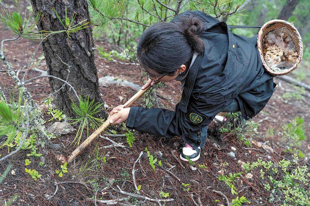 A Jidi villager picks matsutake in the early morning of July 25. GAO YONGWEI/XINHUA