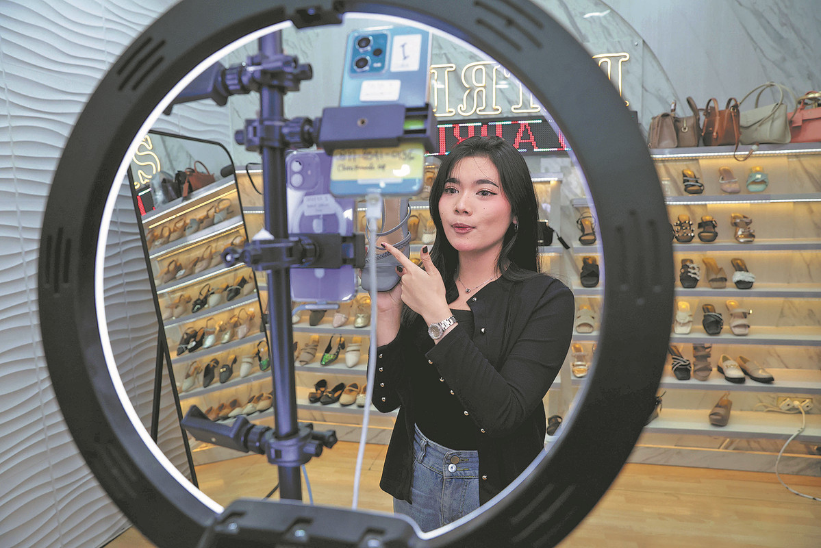 A woman holds a shoe as she livestreams from a women's shoes and bag factory in Bogor, Indonesia, on April 14. The shoe factory relies on the marketplace to sell its products to various countries, including the United States. EPA-EFE