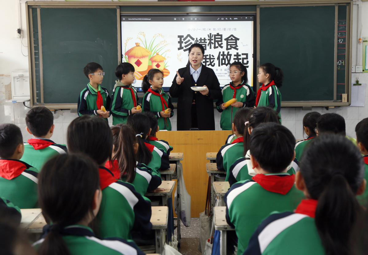 A theme activity on "Cherish Food, Start with Me" is held at a primary school in Ruyang county, Luoyang city, Henan province, Oct 14, 2025. Theme events have been carried out across China to mark World Food Day that falls on Oct 16 annually. [Photo/Xinhua]