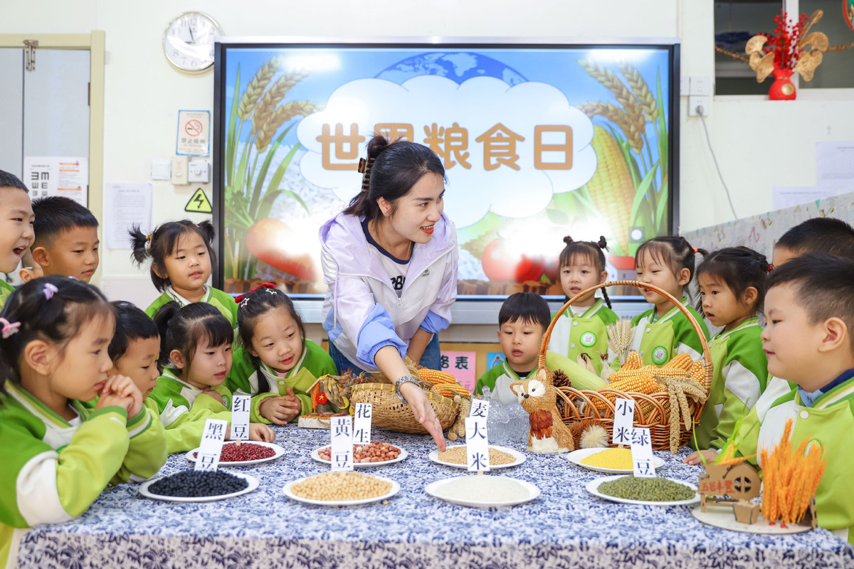 Children learn to identify grains under the guidance of a teacher at a kindergarten in Licang district of Qingdao, East China's Shandong province, on Oct 14, 2025. Theme events have been carried out across China to mark World Food Day that falls on Oct 16. [Photo/Xinhua]