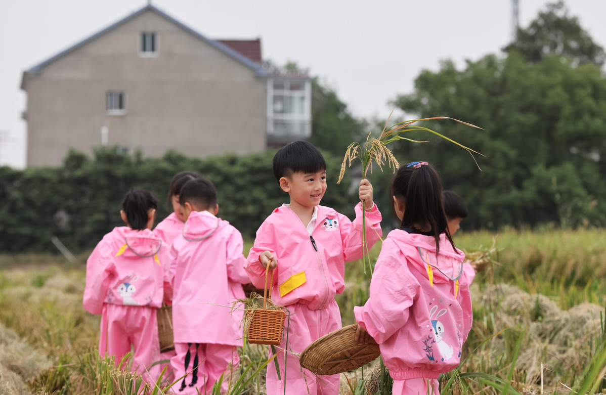 Children from a kindergarten pick up rice ears in a field in Deqing county of Huzhou city, East China's Zhejiang province, Oct 14, 2025. Theme events have been carried out across China to mark World Food Day that falls on Oct 16 annually. [Photo/Xinhua]