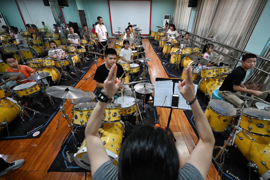 Firefly Galaxy Project, a disability-inclusive band of four children from Yunyang Special Education Center in Yunyang district, Southwest China's Chongqing, rehearses under the guidance of their teachers on Sept 3. [Photo by Li Ye/For chinadaily.com.cn]