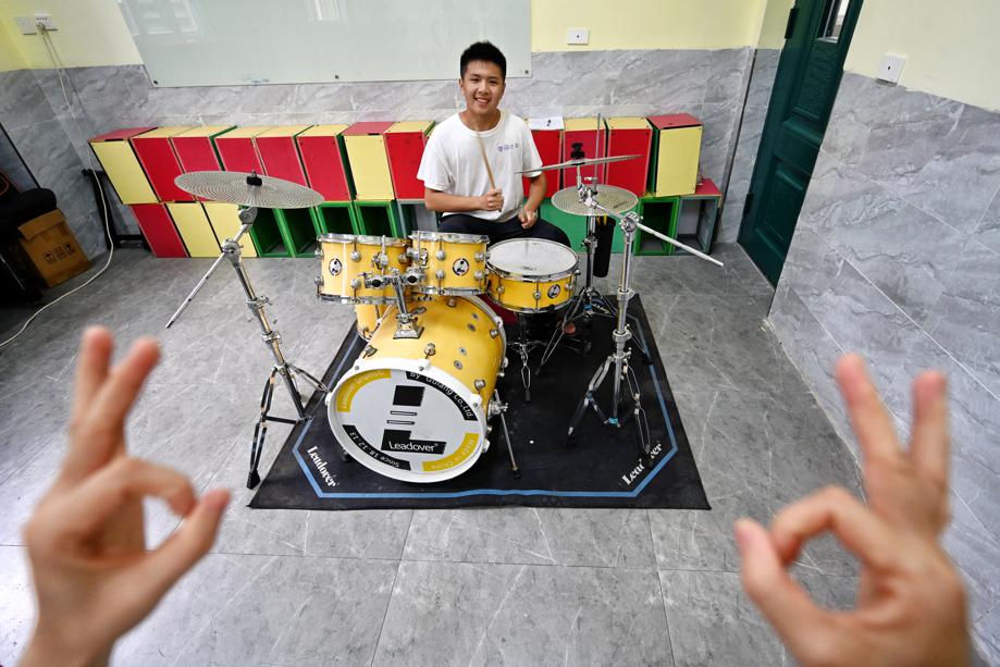 Firefly Galaxy Project, a disability-inclusive band of four children from Yunyang Special Education Center in Yunyang district, Southwest China's Chongqing, rehearses under the guidance of their teachers on Sept 3. [Photo by Li Ye/For chinadaily.com.cn]