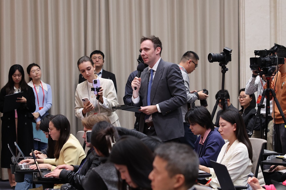 A journalist asks a question during a news conference held by the CPC Central Committee on the guiding principles from the fourth plenary session of the 20th CPC Central Committee on Oct 24, 2025. [Photo by Wang Zhuangfei/chinadaily.com.cn]