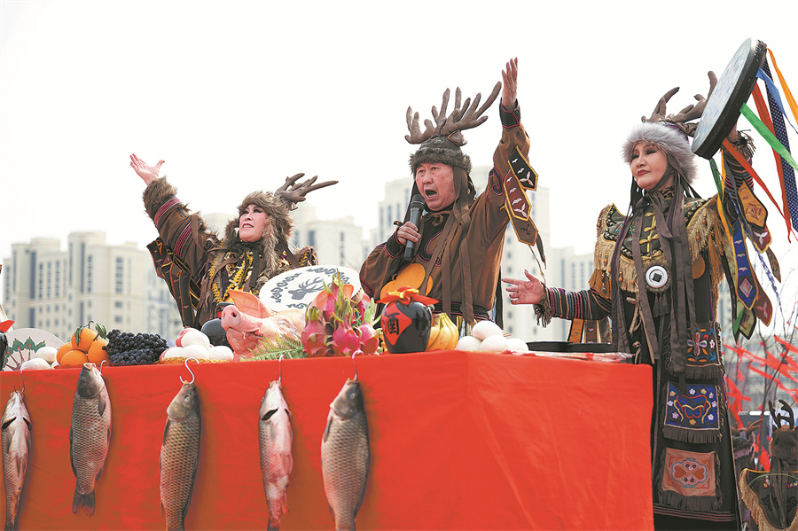 Wu Baochen (center), an inheritor of Yimakan, leads a performance in Jiamusi, Heilongjiang province, on Aug 11. [Photo by Zhang Tao/Xinhua]