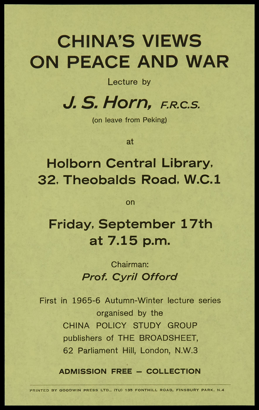 A 1965 poster promoting a China Policy Study Group lecture themed China's Views on Peace and War.