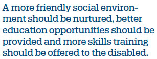 Laws and regulations that protect the rights of disabled persons should be fully implemented with stricter checks. A more friendly social environment should be nurtured, better education opportunities should be provided and more skills training should be offered to the disabled.