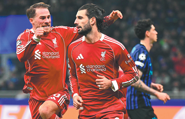 Liverpool's Alexis Mac Allister rushes to celebrate Dominik Szoboszlai scoring from the penalty spot to snatch a Champions League win over Inter Milan at the San Siro on Tuesday. AFP