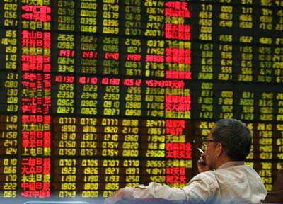 A man sits in front of an electronic board at a stock exchange in Tianjin municipality, October 12, 2007. [Agencies]