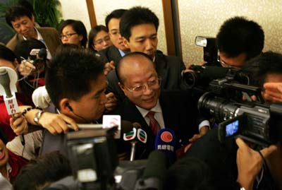 Li Changjiang, minister of the General Administration of Quality Supervision, Inspection and Quarantine, faces a medis scrum after a group interview at the Media center of the 17th National Congress of the Communist Party of China in Beijing on October 17, 2007. [newsphoto]