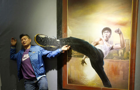 Visitor poses with a 3D painting in Shanghai, April 22, 2014. China's first 3D optical illusions gallery recently opened in Shanghai. [Photo/dfic.cn]