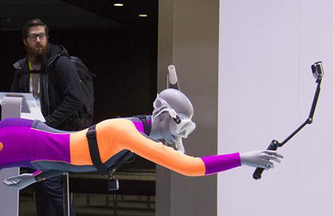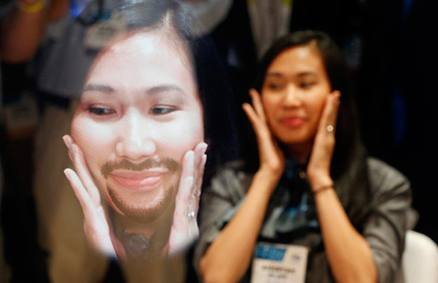 People react as they wear Samsung Gear VR goggles at the 2016 International CES, a trade show of consumer electronics, in Las Vegas, Nevada, January 6, 2016.[Photo/IC]