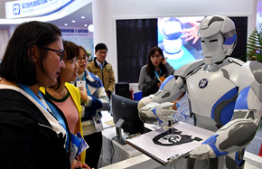 A?man interacts with?an artificially intelligent (AI) robot at the 2016 AI World Expo, held in Beijing on Oct 18, 2016.[Photo/People's Daily Online] |