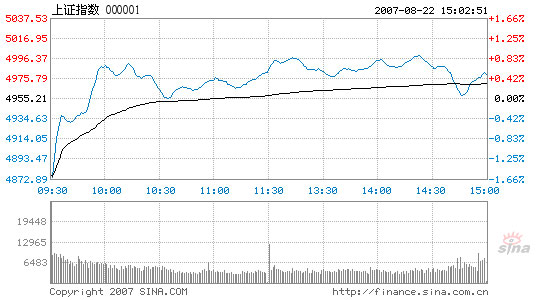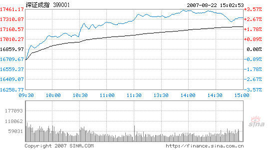 Updated: 2007-08-22 16:55 In response to the fourth interest hike this year by the central bank last night, Chinese stocks opened nearly 80 points lower than yesterday but soon rallied to near the 5,000-point mark. Although both the major indices broke records on their closes today, the benchmark Shanghai index failed to reach that critical psychological frontier. Total turnover of stocks in the major indices expanded to 258 billion yuan, the largest in two weeks. Shanghai Composite Index ![]() The Shanghai Composite Index opened 78.86 points lower at 4,876.35, and hit the lowest 4,861.27 after the opening. But soon it returned to higher levels. As it moved toward the 5,000-point mark, the downward pressures increased. At its highest of 4,999.20, the index was immediately dragged down by selling bids on individual stocks. Finally, it closed at 4,980.08, 24.87 points or 0.5 percent higher than the previous close. Shenzhen Component Index ![]() The Shenzhen Component Index, tracking the smaller Shenzhen Stock Exchange, opened lower at 16,704.93 and stayed within a range of between 16,667.94 and 17,446.10. The index closed at 17,331.99, up 472.02 points or 2.8 percent. Of the A shares listed in Shanghai, 524 went up, 243 closed down and 75 finished unchanged. Of the gainers, 22 were sealed at the maximum growth cap of 10 percent. In Shenzhen, 355 A shares closed higher, including the 12 best performing stocks with 10 percent growth, while 198 slipped down and 83 ended flat. Chalco, TCL and Wuliangye Yibin, three of the largest traders, climbed over 5 percent. The Industrial and Commercial Bank of China, with the largest trading volume in Shanghai, however, dropped 1.7 percent to slow the index. A shares in the food, services and paper industries led the surging waves. B shares finished mixed, with 49 of the total 109 B shares edging up. As the stocks broke through previous highs this week, the total market value of China's stock market also made new records, surpassing the 22 trillion yuan mark yesterday when the Shanghai index closed near the 5,000-point line. All securities listed in the two stock exchanges were worth 22.02 trillion yuan, 1.08 trillion yuan higher than China's gross domestic product last year.