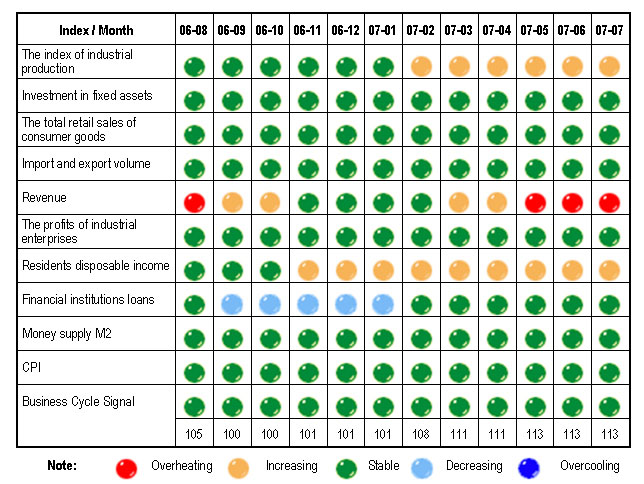 The red-hot stock market partly reflects China's overheated economy, said economists. The National Bureau of Statistics said the macroeconomic climate index in July was 113.3 points, the same as the previous month and close to the "alert" line, indicating that the Chinese economy is moving toward the "heated" zone. At the same time the fiscal revenue indicator has been in the red area for three consecutive months, said the bureau.