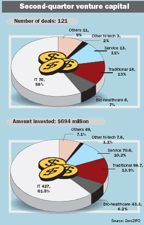 Twelve new funds raised US$2.36 billion in the second quarter, sharply higher than the US$360 million raised by four funds in the first quarter. A total of 121 companies acquired about US$694 million in venture capital in the second quarter, compared with 67 companies that received almost US$419 million during the January-March period. The IT industry regained momentum, topping the list in both the number of venture capital deals and the amount of investment in the second quarter, followed by the traditional and service sectors. Seventy IT enterprises received investments totaling almost US$427 million. "The IT industry will continue to net large amounts of venture capital in the months ahead," says Michael Kang, managing director of the research center at Zero2IPO. But senior economist Andy Xie notes that traditional industries, not the IT sector, are in most urgent need of capital. "There is a new group of companies that has growth potential, and it needs financial and technical support," Xie said in a published report. Among the 121 second-quarter deals, 92 companies acquired investments from foreign venture capital firms, with the rest funded by domestic firms. Industries attracting investment from the two groups varied widely, with foreign venture concentrating on the IT, service and bio-healthcare segments, while domestic venture capitalists were active in traditional and non-IT hi-tech industries. Of the 121 deals, 110 disclosed information on the maturity of companies which received VC investments, with 64 of the deals in an early stage, or 52.9 percent of the total, and 30 in the expansion stage, or 24.8 percent, of deals that were closed. The rest fell outside those categories. Companies in an early stage netted US$267 million, while expansion-stage companies received about US$223 million. "From a long-term perspective, capital firms in China should be turning to businesses in an early stage, rather than expansion or late stages through which they make quick money," says Xie. There were 41 companies financed by private capital that went public or were acquired by other companies, including 18 in the IT sector, 12 in services and eight in traditional industries. Rising with the markets The number of IPOs by Chinese companies reflected globally rising stock markets in the past three months, with 43 new companies listed both at home and overseas in the second quarter, raising about US$20.5 billion, up from US$14 billion in the first quarter. Despite more stringent rules adopted in September 2006 by six governmental authorities to limit domestic companies listing overseas, the number of overseas IPOs increased significantly over the previous quarter. Among the 43 IPOs, 21 were on overseas markets, including the NASDAQ, the Hong Kong Stock Exchange, the New York Stock Exchange (NYSE) and the Singapore Exchange (SGX). The number of new listings was the same as in the second quarter of 2006.