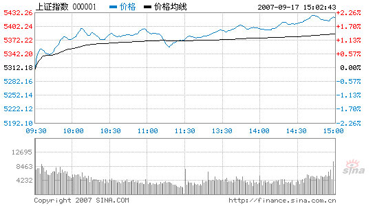 The benchmark Shanghai index opened lower at 5,309.06 and slid to a low of 5,307.77 immediately after the opening, as a response to the weekend's 27 basis-points interest hike. The index then turned upward and, soon before the close, it hit the day's highest at 5,427.17 and turned down slightly to 5,427.17, 109.21 points or 2.06 percent higher than the previous close.