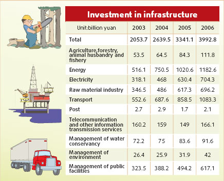 From 2003 to 2006, China made a total fixed-assets investment of 12.03 trillion yuan (US$1.61 trillion) in basic industries and infrastructure sectors, such as agriculture, energy, transport, telecom and public facilities, the NBS report said.