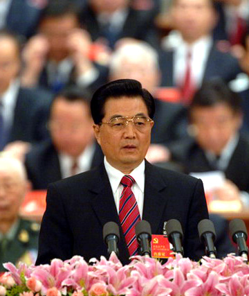 Chinese President Hu Jintao, also general secretary of the Communist Party of China (CPC), gives a keynote speech at the opening of the 17th National Congress of the CPC in Beijing to map out China's all-round development for the coming five years, October 15, 2007. [people.com.cn]