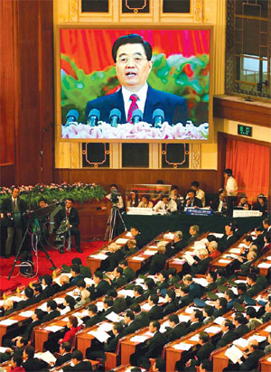A live image of Party General Secretary Hu Jintao is seen on a giant screen inside the Great Hall of the People at the opening of the 17th National Congress of the Communist Party of China. Hu's keynote report was broadcast live yesterday morning on TV, radio and the Internet.[AP]