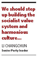 The priority for the moment is to study, publicize and implement the essence of the Party congress, Li said. "We should step up building the socialist value system and harmonious culture, and unite all forces to promote our cause of building socialism with Chinese characteristics," he said.