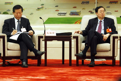 Shang Fulin (L), chairman of the China Securities Regulatory Commission, and China's central bank governor Zhou Xiaochuan attend the financial units delegation discussion sessions of the 17th National Congress of the Communist Party of China in Beijing October 16, 2007. Shang warned investors on Tuesday that risks are increasing as the country's stock markets rise. [Reuters]