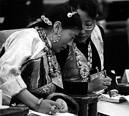 Lun Zu (left) and Deji Zhuosang, delegates from the Tibet Autonomous Region attending the 17th Party Congress, yesterday discuss the political report delivered by Hu Jintao on Monday. [China Daily]