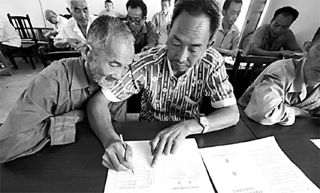 Farmers fill out their ballots on September 27 to determine the new Party secretary of Fuxinqiao, a village in Chongqing Municipality. Chen Shichuan