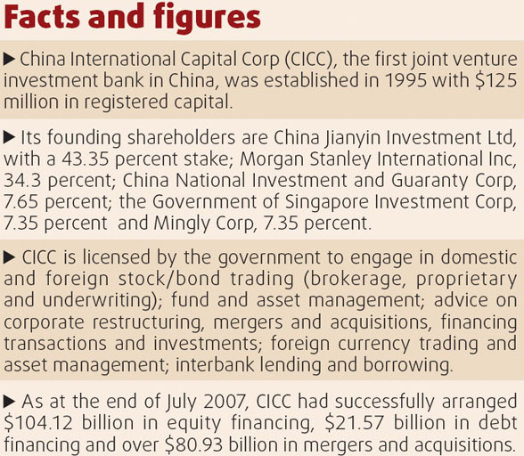 Updated: 2008-01-08 07:21 US financial services firm Morgan Stanley plans to sell its entire stake in China International Capital Corp (CICC), the nation's first investment bank, sources close to the two companies said yesterday. Morgan Stanley currently holds a 34.4 percent stake in CICC, but with a limited role in the investment bank. The sources said the US firm might sell its entire stake in CICC and invest in another local brokerage. Earlier in December, local media reported that the global financial services firm was planning to buy a 33.5 percent stake in Shanghai-based China Fortune Securities for 4 billion yuan. The reports said Morgan Stanley had signed an agreement with China Fortune Securities to set up a joint venture investment bank and that Morgan Stanley might be interested in a controlling stake. But under new rules issued by the China Securities Regulatory Commission (CSRC) on December 28, the maximum stake foreign investors can hold in a local securities firm will remain at around 33.3 percent, despite lower barriers in other areas. China Fortune Securities ranks 48th among 104 brokerages, with registered capital of 1 billion yuan by the end of 2006, according to the CSRC. The CSRC's new rules issued on December 28 also require 1.2 billion yuan in net capital in the last year for a securities firm if it wants to set up a subsidiary. "To meet the requirement, Morgan Stanley and China Fortune might increase their net capital before they set up a joint venture investment bank," said Liang Jing, an analyst with Guotai Jun'an Securities. "The new rule may not be a big problem for Morgan Stanley and China Fortune." Morgan Stanley is expected to become one of the first foreign firms to invest in a local securities firm in 2008, after the government resumed approvals of foreign joint ventures based on the China-US Strategic Economic Dialogue. The government banned international companies from investing in local securities firms in October 2006, concerned that it would threaten local brokerages recovering from a four-year slump. Before the ban, UBS and Goldman Sachs Group Inc were the only foreign firms with brokerages in the country. China's securities industry scored big money last year thanks to the bullish stock market. By June 2007, 24 leading brokerages had made a total net profit of 37.9 billion yuan, a year-on-year increase of 425 percent. Shanghai-listed CITIC Securities yesterday predicted fivefold net profit growth for 2007 compared with 2006. The company posted a net profit of 2.4 billion yuan in 2006. ![]()