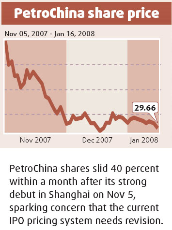 Updated: 2008-01-17 09:29 When shares slumped in PetroChina, Asia's most profitable company, after its stellar debut in Shanghai, mainland listing rules came under the spotlight. Insiders said the fundamental problem is the rules governing initial public offerings (IPOs), which seem to favor institutional investors over individuals in the pricing and issuing of shares. As a result, many individual investors who fail to obtain an IPO allotment must buy shares when trading begins. That rush for stocks has on many occasions pushed prices to unsustainable levels. The China Securities Regulatory Commission and the Shanghai Stock Exchange at the end of last year assembled a group of stockbrokers and insurance companies for a one-day discussion to get their views on the issue in general and the poor performance of PetroChina's A shares in particular. Shares in PetroChina opened at 48.6 yuan ($6.70) on November 5, and slid 40 percent to 31 yuan within a month. The sharp fall of China's largest stock also triggered a slide on the benchmark Shanghai Composite Index. The phenomenon is not unique to PetroChina. The share prices of many other newly listed stocks have also nose-dived after initial spurts. "These records show that the current pricing system has flaws, resulting in failure to establish a fair IPO price," said Gui Haoming, an analyst at Shenyin Wanguo Securities. "There are vested interests influencing the prices of IPOs," said Wu Feng, an analyst at TX Investment Consulting Co Ltd. The current rules, which took effect in September 2006, give three ways to subscribe to share issues: private placements to strategic investors, private special subscription for institutional investors, and open online subscription for individual investors. Institutional investors that subscribe for IPOs can count on getting an allotment in proportion to the size of the subscription, while only a small portion of individual investors' subscriptions are successful. "The current issuing rules are not suitable in a bullish stock market, which entices many individual investors to try to snap up large quantities of IPO shares as soon as the company is listed," said Zhu Haibin, an analyst at Essence Securities. Meanwhile, the large amounts of capital temporarily frozen in IPO subscriptions are seen to have a negative impact on financial market stability. Liu Shiyu, deputy governor of the People's Bank of China, was quoted as saying that the government should restructure the pricing system in the financial market and review stock-issuing rules to minimize the impact on interest rates and the government bond yield curve. Analysts said interest rate fluctuations have made it difficult for central banks to carry out monetary policies when commercial banks are faced with a sudden shortage of liquidity as it flows from bank deposits to IPO subscriptions. Roughly 200 billion yuan of banks' financial products focus on IPO subscriptions, statistics show. The average annual IPO subscription from institutional investors - including mutual funds, State-owned firms, insurers and listed companies - amounts to around 2 trillion yuan.