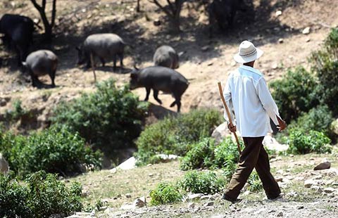 Herding wild boars on a mountain