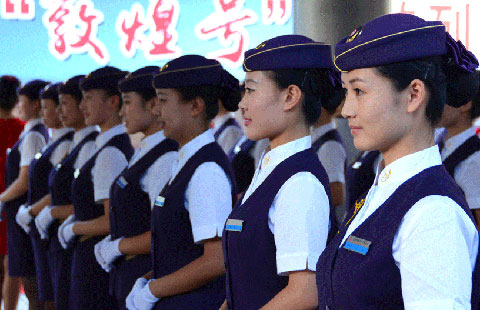 Stewardesses of the tourist line Y667- between Lanzhou and Dunhuang, west China's Gansu province – on July 10, 2014, before the first train of this line left Lanzhou in the evening. The initiative aims to attract tourists to the province. [Photo/CFP] |