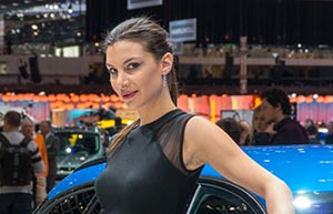 A model is pictured next to a Jaguar XFR-S Sportbrake on March 4, 2013, at Geneva International Motor Show in Switzerland.