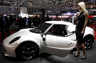 The Alfa Romeo 4C displayed on the company's booth during the first media day of the Geneva Auto Show.
