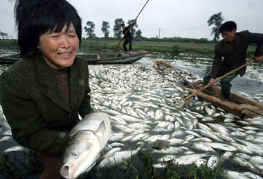 take out dead fish from their pond in Xiaoshan District of Hangzhou,