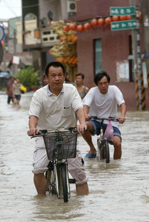 Residents ride their bicycles along a street flooded by rainfall caused by typhoon Bilis in southern Pingtung county July 15, 2006. [Reuters]