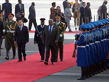 Mwanawasa (R Front) inspects the guard of honor upon his arrival at