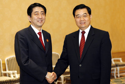 Hu said that the meeting reflects the "common will of the two countries to improve bilateral relations." The two countries agreed to build a "strategic relationship of mutual interests" and foreign affairs departments will work on details of such a relationship. Hu called for more cultural and youth exchanges to increase friendship between the two peoples so as to consolidate the foundation for bilateral ties. The Chinese President advocated drafting medium and long-term plans for bilateral co-operation in sectors of trade, investment, information, energy, environmental protection and finance. Abe suggested starting ministerial-level meetings for economic and trade co-operation as well as dialogue between energy departments of the two countries to increase partnership in energy conservation and environmental protection. "President Hu adopted a very positive attitude towards Abe's proposal and believes it is very helpful," said Foreign Ministry spokesman Liu Jianchao after the meeting. The two leaders also agreed to make joint efforts to promote peace, stability and development in Northeast Asia and increase co-ordination in pushing regional integration. Hu cited history and Taiwan as "sensitive questions" concerning the political basis for bilateral ties and called for them to be "appropriate handled." Abe noted that Japan will handle the question of Taiwan according to the joint statement of the two sides, adhering the one-China policy and opposing Taiwan "independence." Both Hu and Abe expressed willingness to advance negotiations on the East China Sea and make it an area of "peace, friendship and co-operation." The two sides have a long-running row over development of natural resources in a disputed area of the East China Sea. Hu said that they should use negotiations and talks, put aside disputes and seek common development. During the meeting, Abe again extended an invitation for Hu to visit Japan next year. Hu accepted the invitation, according to spokesman Liu. |